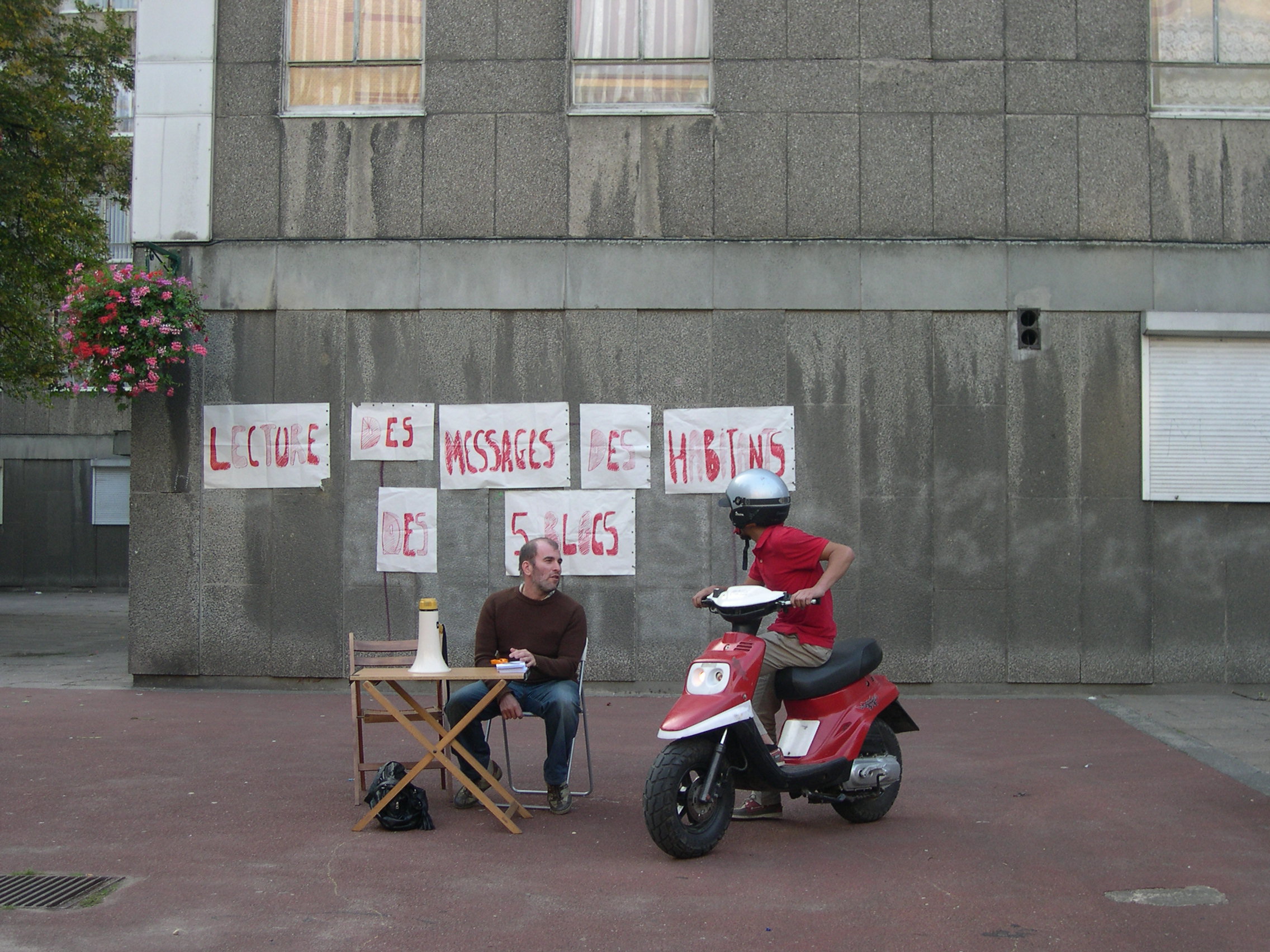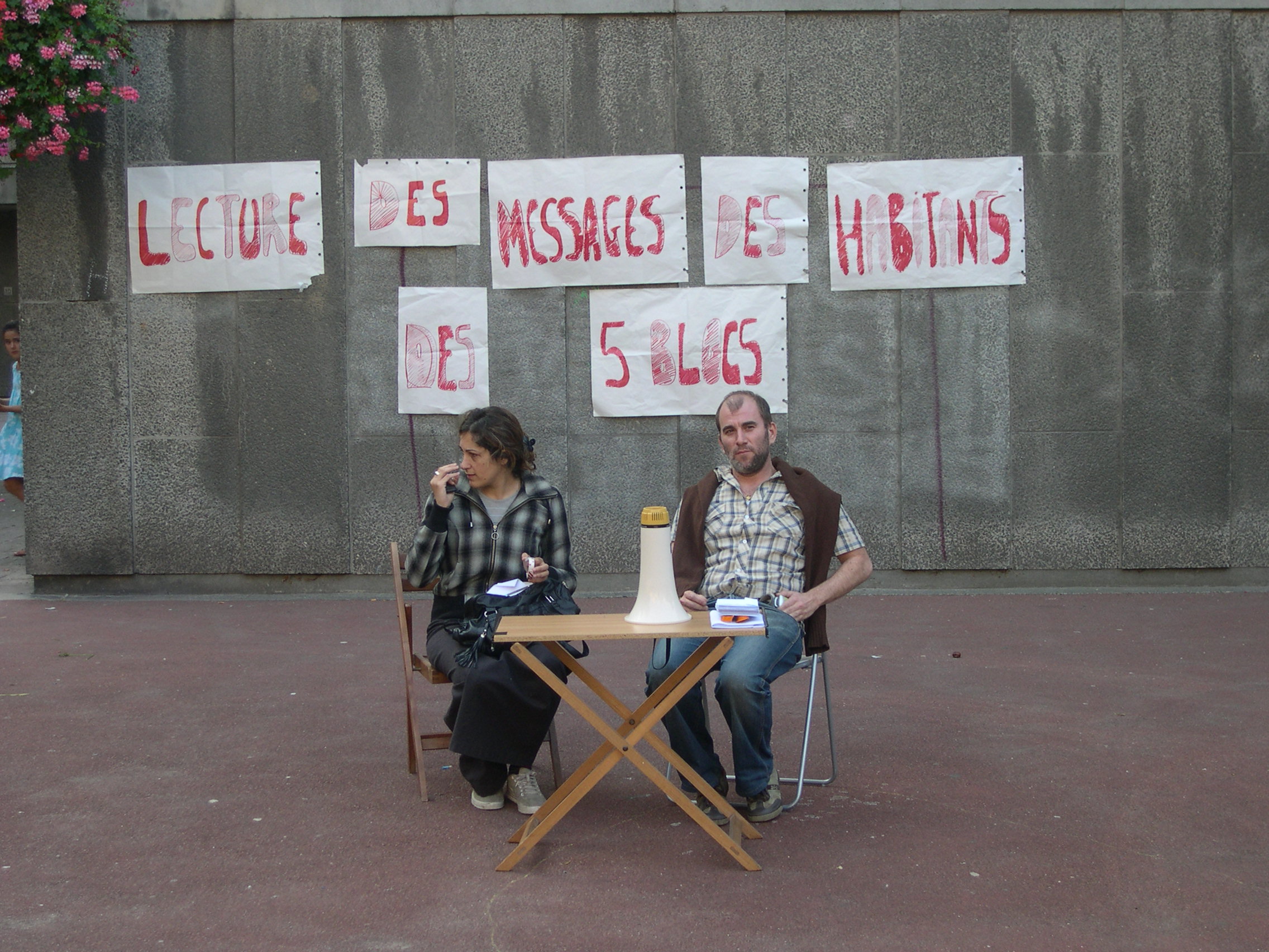 We worked for 2 weeks in a social housing area downtown with teens and seniors doing artistic animations. We found out there was discontent and miscommunication between people of these 5 blocs. They are afraid to say what they think.We asked them to write anonymously anything they’d like to say and gave them an envelope which we won’t open until the day of our performance.The last day of our visit we went there and stood in the courtyard with a table and 50 envelopes. In front of a public that wanted to listen to what others wanted to say.We opened each envelope and read them with a loudspeaker to be sure it will be loud enough.