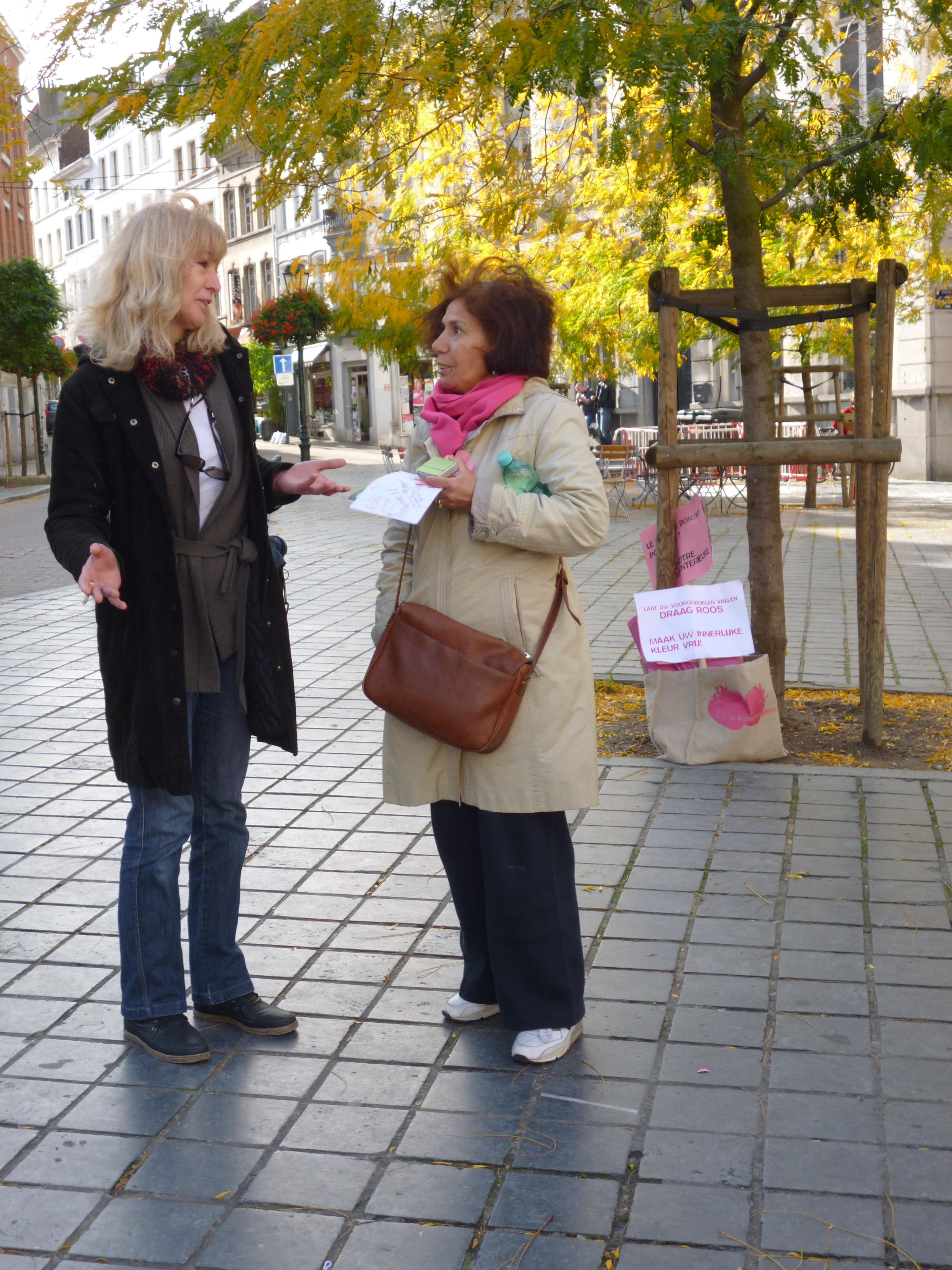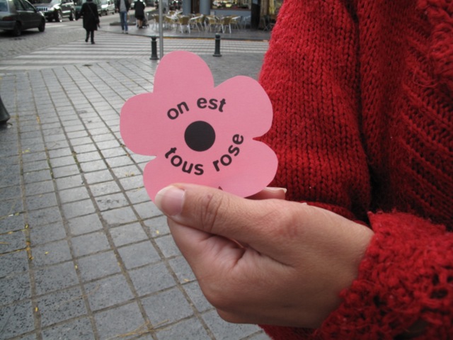 Une deuxième performance consistait au pouvoir des femmes de gérer la vie publique de la cité.Profitant de la période d’élections politiques, chacune des femmes a dessiné un flyer avec 5 propositions de valeurs importantes à mettre en place pour améliorer notre vie dans la ville.Toutes les six sous le même slogan « On est tous rose », lié au thème de la tolérance et de l’égalité, nous sommes allées sur le parvis de St Gilles à la rencontre des habitants de ce quartier pour promouvoir les valeurs que nous défendons.